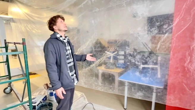 В итоге 1 декабря в помещении неожиданно для него начался ремонт — в пик по посещаемости учебных программ, а не во время зимних каникул. Часть, где идут работы, закрыли перегородкой, которая, по опасениям жителя, может в любой момент упасть. Конструкция плохо закреплена, из-за чего педагоги не могут продолжать уроки.
